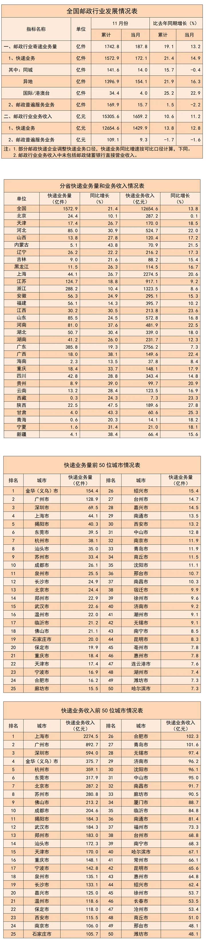 1.部分郵政快遞企業調整快遞業務口徑,快遞業務同比增速按可比口徑計算。